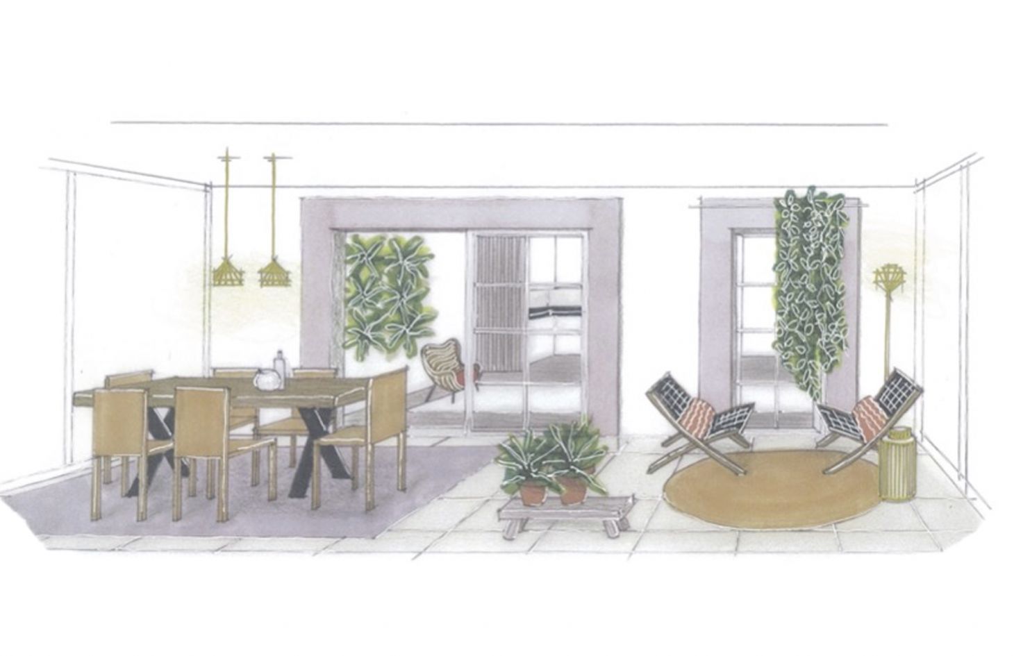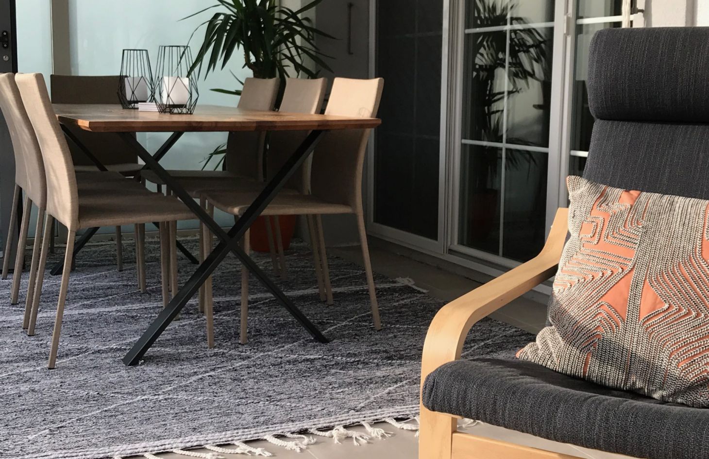 La salle-à-manger ayant été déménagée dans la véranda, il fallait redécouvrir comment occuper l’espace devenu vide de la pièce principale. Le choix s’est donc porté sur de grands tapis marocains de style Beni Ouarain qui accueilleraient confortablement les amoureux et qui sans le savoir, ramenaient le jeune homme à des souvenirs d’enfance.